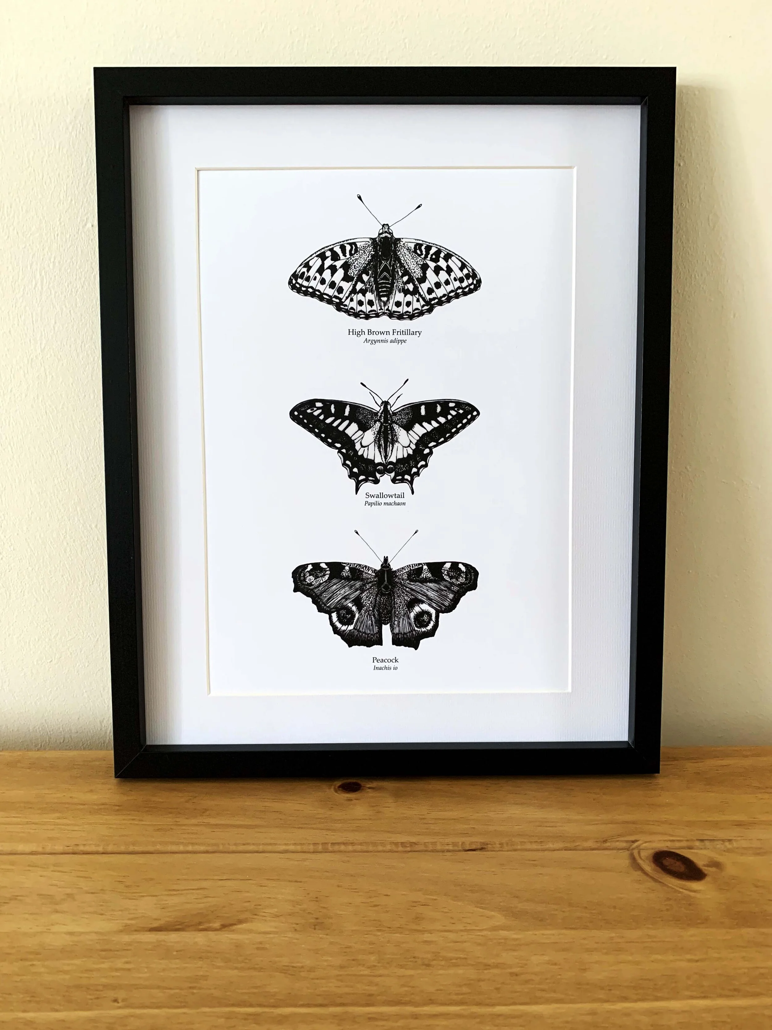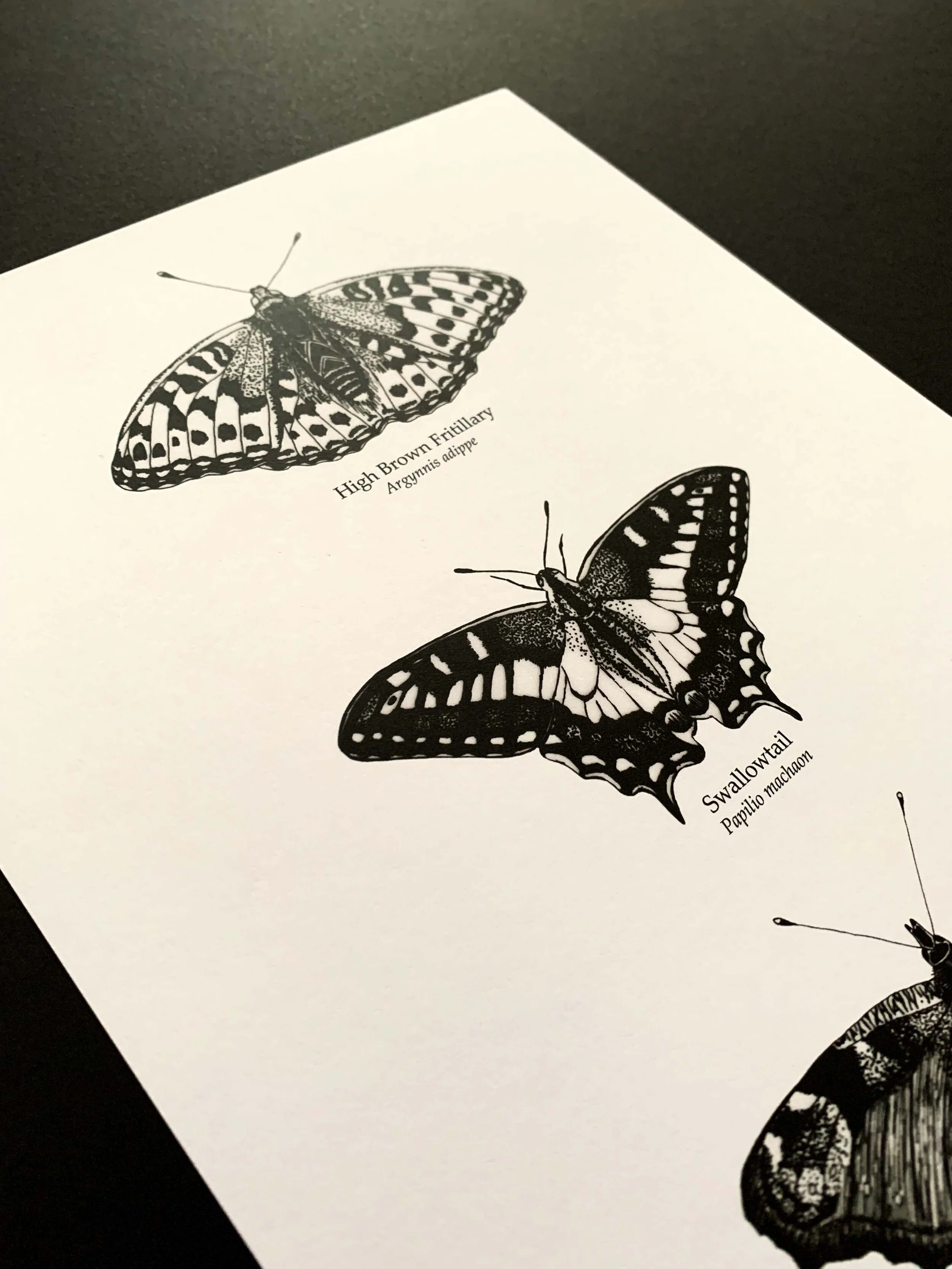 This open edition A4 British Butterflies print was hand drawn using Rotring Isograph drawing pens, finalised in Adobe Photoshop, and professionally printed on 225gsm premium matte paper for a natural and artisanal feel.